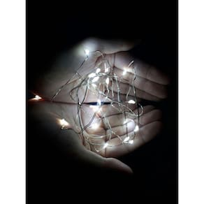 - 20 micro luzes de LED. - Cor Led Branco Quente luzes amareladas - Tamanho do fio: 2 metros - Material do fio: Cobre - Luz fixa - O fio é a prova d'água exceto compartimento de pilhas/baterias . - Funciona com pilhas ou baterias já inclusas .