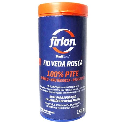 Fio Veda Rosca 150 Metros - 104652 - Firlon Fio Veda Rosca 150m Firlon 104652 Fio Veda Rosca 150 Metros - 104652 - FIRLON Aplicação: Conexões roscadas plásticas e/ou metálicas. Adequado para vedações de água quente e fria, água potável, gás, ar comprimido, óleos e gases industriais. Conexões de difícil acesso, onde o manuseio com a fita veda rosca tradicional não é possível. Componentes sujeitos a baixas ou elevadas temperaturas. Temperatura de Trabalho: de - 90C até +240C.