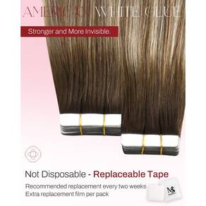 5. Fita de alta qualidade Extensões de cabelo Moresoo Tape feitas de fita branca americana de alta qualidade para maior vida útil e maior adesão. Cuidados cuidadosos prolongam a vida útil para 2 a 18 meses.