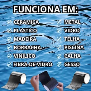 Flex Tape é especialmente formulado com um espesso, flexível, emborrachado que está em conformidade com qualquer forma ou objeto. Flex Tape pode ser aplicado quente ou frio, molhado ou seco, mesmo sob a água. Flex Tape sela instantaneamente água, ar e umidade para criar uma barreira super forte, flexível, estanque Flex Tape pode resistir à colagem nas seguintes superfícies: Materiais plastificados, superfícies siliconadas, gordurosas, oleosas, sujas ou porosas, materiais e tecidos impermeáveis ou repelentes à água. Sempre teste antes de usar.