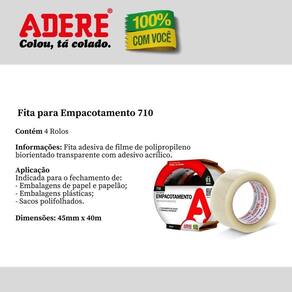 A Fita para Empacotamento 710 45mm x 40m; - Marca: Adere; - Modelo: Uso Geral; - Cor: Transparente para Empacotamento Branca; - Possui adesivo acrílico à base dágua. - Medida: 45mm x 40m;