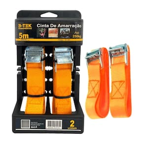 - Produto: Fita de Amarracao - Marca: BTek - Comprimento: 5m - Largura: 25 cm - Capacidade de Carga: 250 kg - Unidades por Kit: 2 - Material da Fita: Poliéster de alta tenacidade - Fechamento: Catraca metalica