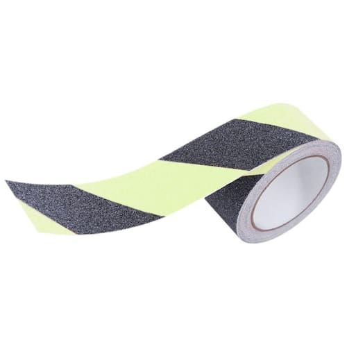 Esta fita antiderrapante preta, possui faixas verde fluorescente, ajudando a evitar acidentes e proporcionando maior segurança.