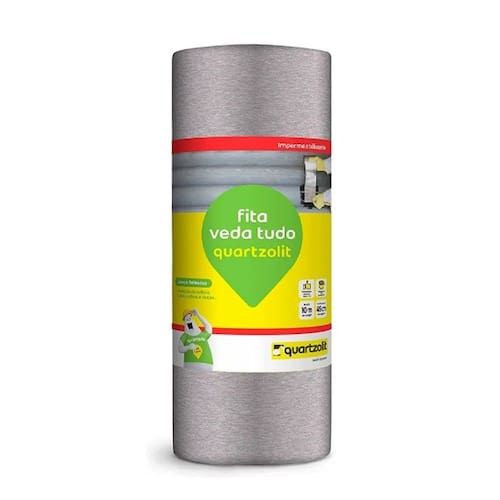 Fita Veda Tudo Quartzolit é uma fita autoadesiva com película de alumínio flexível, protegida por um filme de PVC que é retirado ao aplicar a fita, facilitando a colagem ao substrato.