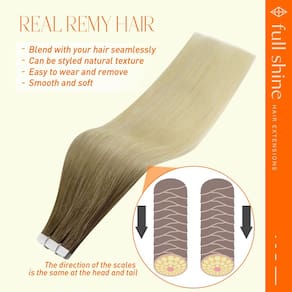 Extensões de cabelo Ombre Balayage Tape in Hair é o símbolo da Full Shine Hair. Se você está cansado da cor pura básica, escolha a cor Ombre Balayage é uma escolha correta, experimente! Detalhes do produto: Material do cabelo: cabelo humano real Textura: Liso e tem uma onda natural quando molhado ou deixado para secar ao ar livre ou difuso. Fita: Fita branca americana Tamanho da fita: 0,8 cm x 4 cm Conjunto: 2,5 g/peça, 20 peças/pacote, 50 g/pacote Aviso antes de fazer o pedido 1. Quantidade necessária: 150-250 gramas, 3-5 pacotes são recomendados para toda a cabeça. Se você tiver cabelo curto, reduza 1 pacote. 2. Sobre o estilo: nossas extensões de cabelo com fita humana são exatamente como o seu próprio cabelo e podem ser modeladas, enroladas ou alisadas conforme desejado. O DIY diário reduzirá a vida útil das fitas, use mais nutrição. 3. Sobre a cor: nossa fita de cabelo pode ser mais escura, mas não mais clara. Sempre teste um pequeno pedaço quando você tingir. 4. Sobre a lavagem: lave seu próprio cabelo sem condicionador quando for a primeira vez para aplicar em . Não lave o cabelo pelo menos 72 horas após a fixação, a lavagem diária não é boa para suas extensões. Use xampu e condicionador sem sulfato no cabelo 5. Cuidados: sugerimos que você use o óleo para reviver o cabelo seco; dormir com uma touca de seda ou compre uma fronha de seda para proteger o cabelo. 6. Sobre o uso: O cabelo pode ser reaproveitado com fita de substituição. Sugerimos ajustar a fita a cada 2-5 semanas para manter o cabelo bem. Encontre beleza e confiança com Full Shine Hair. - Sobre a instalação: o sanduíche é uma boa maneira, as duas peças devem ser alinhadas, não adicione muito cabelo no meio, ou ele cairá; você pode cortar suavemente as fitas uma vez com um alisador de cabelo, não aqueça a fita usando temperaturas excessivamente altas - Aparência natural: extensões de cabelo com fita adesiva podem adicionar estilo e volume ao seu cabelo com resultados naturais e discretos; ao escolher a cor que se adapta ao seu tom de cabelo, você pode desfrutar de cabelos mais cheios sem que ninguém perceba que você está usando extensões de cabelo - Disponível em vários tons: extensões de cabelo humano com fita adesiva oferecem muitos tons diferentes, balayage e ombré e muitas cores puras; você também pode criar sua mistura preferida usando dois ou três tons diferentes para obter um visual natural - Dupla face, invisível e substituível: como eles são muito leves e pegajosos o suficiente, eles se unem bem ao seu cabelo real sem qualquer desconforto. O uso adequado não danificará seu couro cabeludo e não causará nenhum desconforto. Você pode usar um removedor de adesivo ao remover - Como desembaraçar: nunca durma com extensões de cabelo molhado; sempre certifique-se de que o cabelo esteja seco e puxado para cima; use um pente de dentes largos nas pontas do cabelo, alise o cabelo, aplique azeite de oliva. Também pode ser utilizado com spray desembaraçante - Mais opções de penteado: se você quiser experimentar um novo visual, as extensões de cabelo com fita Full Shine podem ajudá-lo a alcançar seus objetivos de cabelo desejados; já que são cabelos humanos reais, que podem ser lavados, fortalecidos e enrolados usando um alisador - Uso recomendado: para cabelos grossos, 1-2 pacotes para aumentar o peso e 3-4 pacotes para aumentar o comprimento; para cabelos finos, 3-4 pacotes para aumentar o peso e 1-2 pacotes para aumentar o comprimento; você só precisará visitar o salão a cada 3 a 6 semanas após as extensões estarem em - Menos manutenção e antes da instalação: ao contrário de outros métodos, as extensões de cabelo com fita adesiva exigem menos manutenção; lave sua fita em extensões e seque com secador, não use condicionador ou óleo antes da instalação; é melhor você ir a um salão para instalar - Após a instalação: não lave a fita adesiva no cabelo em 48 horas, sugerimos que você use um condicionador melhor para cuidados profundos; nunca coloque o condicionador nas raízes do seu cabelo de qualquer maneira; isso pode fazer com que suas extensões de cabelo escorreguem