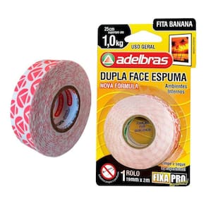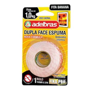 Fita Banana Dupla Face Espuma Fixa Pro 19mm x 2m Até 1,0kg é indicada para montagem de união de placas, plásticos, sinais, emblemas, uso geral na indústria, espelhos, placas de sinalização, vidros, acrílicos, policarbonatos, laminação de vidros, este produto possui excelente capacidade de conformação resistência em aplicações internas e externas.Especial para pendurar objetos leves, bricolagem, artesanato.Esse modelo de fita dupla face espuma dispensa o uso de pregos e parafusos e evita furos na paredeA superfície deve ser limpa e seca, livre de imperfeições e isenta de graxa, óleo, primer, cera, pó ou resíduos contaminantes. Evitar superfícies repintadas ou com pintura recente. Pressionar a fita durante 30 segundos para aplicação.Especificações:Marca: Adelbras.Embalagem: Blister com 1 rolo.Tipo de Fita: Dupla Face Espuma Banana .Medidas: 19mm x 2 metros.Resistência: cada 25 cm de fita suporta até 1,0kg.Cor: Branca.Composição: Espuma de polietileno com espessura de 1,0mm e adesivo acrílico solvente em ambos os lados.