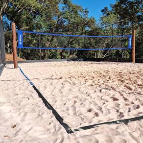 Especificações: - Tamanho da quadra: 8x16m - Material: Polipropileno CA - Contém: 6 fitas e 6 fixadores de ferro galvanizado - Cor: Preta e Azul - Espessura: 5cm
