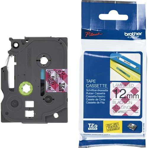 A fita decorativa Brother TZE MPRG31, possui fundo xadrez em vermelho, com impressão em preto. Para rotuladores Brother, a MPRG31 possui 12mm x 4m, além de contar com adesivo de forte adesão, perfeito para identificação de equipamentos e uso em comércio.