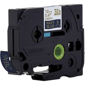 Fita cetim decorativa, cor azul marinho com impressão em dourado, para uso nos rotuladores Brother PTouch. A fita TZE RN34 é indicada para embalagens e presentes, possuindo 12mm de largura e 4m de comprimento.