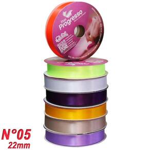 Fita de cetim progresso com acabamento, 22mm de largura e 100 metros de comprimento, indicada para trabalhos artesanais, laços, embrulhos de presente e trabalhos manuais em geral.