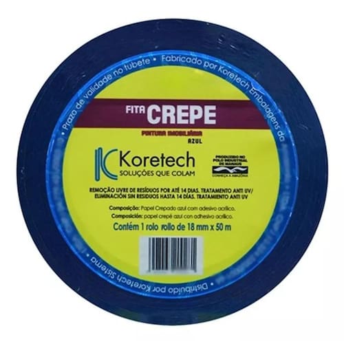 Fita crepe azul imobiliária 48mm x 50m koretech - 200298 Descrição = 200298 - fita crepe azul imobiliária 48mm x 50m - rf.34.11.4 0003 A fita crepe para pintura 48mm x 50 metros azul da korotech é uma fita de papel crepado com adesivo acrílico com alta adesão, excelente para uso na construção civil e acabamento, faz curvas com facilidades e possui um excelente impermeabilizante aos solventes tradicionais. Fácil remoção em até 14 dias. Ideal para uso em pinturas automotivas e imobiliárias.