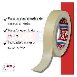 Descrição Técnica: Marca: Tesa Cor: Bege Modelo: Uso geral e automotivo Cód. Referência: 53123 Tamanho: 40m x 18mm Espessura total: 125 µm Material do suporte: Papel levemente crepado Tipo de adesivo: Borracha sintética Adesão ao aço: 3,6 N/cm Ean: 7898565670348