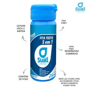 A Fita de Teste 5 em 1 Para Piscina Suall é ideal para garantir a qualidade da água da sua piscina, facilitando a análise de cinco parâmetros essenciais: cloro livre, pH, alcalinidade total, dureza e ácido cianúrico. Com uma leitura rápida e fácil, as fitas Suall proporcionam resultados precisos para o balanceamento químico, mantendo a água sempre segura e adequada para o uso. Com o uso regular, você assegura a saúde dos banhistas e preserva a durabilidade dos equipamentos de sua piscina. Contém 25 fitas de teste que possibilitam um monitoramento completo, garantindo conforto e segurança para todos os usuários.