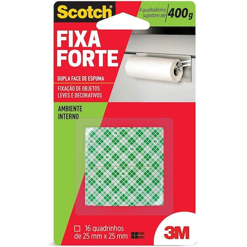 DetalhesExcelente fixação - 4 quadradinhos suportam até 400 gAplicação fácil, rápida e seguraSubstitui pregos e parafusosA Fita Dupla Face 3M Scotch® Fixa Forte Espuma pode ser usada em ambientes internos para fixar de forma permanente canaletas, porta-chaves, quadros, espelhos e peças de decoração, entre outros. Sua aplicação é fácil, segura e evita a perfuração de superfícies.A Fita Dupla Face 3M Scotch® Fixa Forte Espuma (também conhecida como fita banana) proporciona fixação permanente de qualidade profissional. Sua aplicação limpa e sem barulho dispensa o uso de pregos e parafusos. É perfeita para fixação de objetos em qualquer superfície lisa, como paredes, acrílicos, vidros, plásticos, metais, madeiras com verniz ou pintadas e revestimentos (que não recebam umidade), em ambientes internos. Não amarela com o passar do tempo.Aplicações sugeridasCanaletasPorta chavesQuadrosEspelhos
