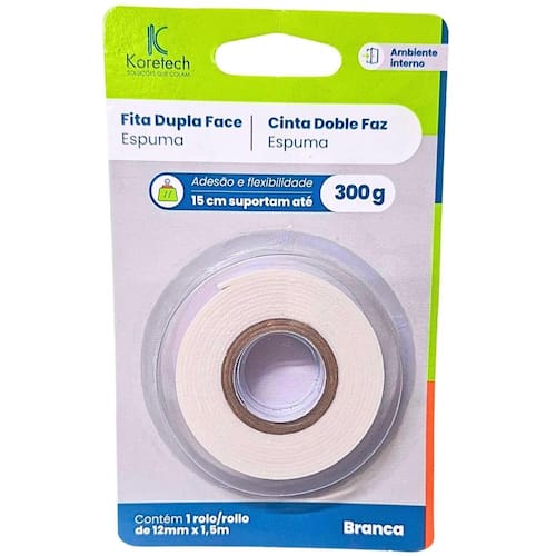 Fita dupla face espuma br 12mmx1,5 1/16 Fita dupla face espuma koretech - fixação segura e prática A fita dupla face espuma koretech é a solução ideal para fixações práticas e seguras em ambientes internos. Com alta adesão e flexibilidade, essa fita de 12mm x 1,5m é perfeita para colar objetos leves em superfícies lisas sem a necessidade de furos ou pregos. Cada 15cm de fita suporta até 300g, tornando-a ideal para quadros, espelhos, placas decorativas, suportes e outros itens leves. Benefícios