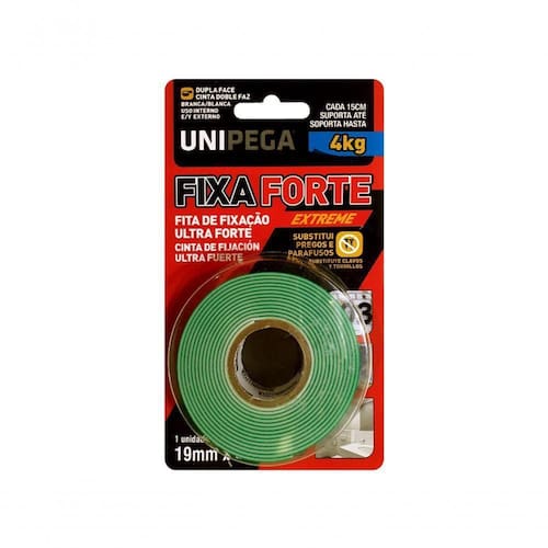 Fita Dupla Face Fixa Forte Extreme 19mm X 2m - Unipega Fita Dupla Face Fixa Forte Extreme 19MM X 2M - Unipega Bateu aquela vontade de pendurar um quadro, espelho, ou mesmo renovar a decoração daquele espaço interno? Furadeira, sujeira e furos desnecessários na parede são soluções do passado! A fita Dupla Face Fixa Forte Extreme Unipega permite a fixação objetos de até 4kg com a maior praticidade. Espelhos, nichos, quadros, porta-chaves, canaletas e muitas outras opções. Aplicou, fixou! Fácil assim.