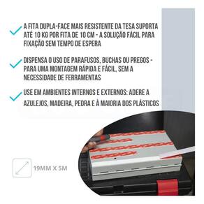 Modo de usar: 1- Para que a fita de montagem desenvolva todo o seu poder de fixação, o objeto e a superfície devem estar livres de poeira, sujeira e graxa. 2- Não toque na superfície adesiva aberta, pois isso pode prejudicar a resistência adesiva. 3- Fixe primeiro a fita de montagem dupla-face na superfície mais áspera. 4- Aplicar em tiras verticais e em toda a extensão do objeto ou superfície. 5- Pressione firmemente a fita de montagem por pelo menos cinco segundos. 6- Aplique o objeto sobre o local desejado.