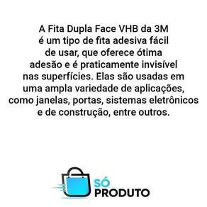 A fita dupla face vhb da 3m é um tipo de fita adesiva fácil de usar, que oferece ótima adesão e é praticamente invisível nas superfícies. Ela é altamente resistente e durável a longo prazo, sendo capaz de substituir rebites, soldas a ponto, adesivos líquidos e outros fixadores mecânicos ou permanentes. Além disso, ela tem alta resistência a solventes e cria um selo permanente contra água e umidade. A fita compensa a dilatação térmica das partes unidas, proporciona distribuição do esforço mecânico e possui colagem permanente com acabamento limpo. A fita 3m Vhb Dupla-face de espuma ig-110wf é adequada para fixação de chapas metálicas em ônibus, placas de sinalização, montagem em materiais de linha branca, entre outros. A fita é composta por adesivo acrílico durável com propriedades viscoelásticas e pode ser usada em uma ampla variedade de substratos, incluindo alumínio, aço galvanizado, inox, aço pintado, vidro, epóxi, cerâmica e muitos outros. As fitas vhb foram criadas em 1980 pela 3m como as primeiras de seu tipo, combinando conformidade e uma ligação forte e permanente, sendo uma alternativa comprovada para parafusos, rebites e outras formas de fechos mecânicos. Elas são usadas em uma ampla variedade de aplicações, como janelas, portas, sistemas eletrônicos e de construção, entre outros.