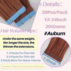 - Especificação do cabelo: 30,5 cm-61 cm, 30G, 20 peças/pacote. Nossas extensões de cabelo ruivo são leves e confortáveis de usar, adequadas para cabelos finos ou finos. 1 pacote para destaque, 2-3 pacotes para volume e 4-5 pacotes para uma cabeça inteira