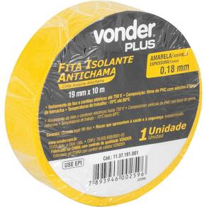 Vonder - Fita Isolante, 19 Mm X 10 M, Amarela Fita isolante, 19 mm x 10 m, amarela, Vonder11. 37. 191. 001 Conteúdo da Embalagem:1 Fita isolanteIndicada para isolar fios e cabos elétricosFita antichama com temperatura de trabalho de -10°C até 80°C Detalhes TÉCNICOSLargura x comprimento da fita isolante: 19 mm x 10 mMaterial da fita isolante: Filme de Pvc com adesivo a base de borrachaCor da fita isolante: AmarelaEspessura da fita isolante: 0,18 mmTensão máxima de isolamento da fita isolante: 750 VGarantia - E Cdc : Garantia legal: 90 dias Ean: 7893946002596