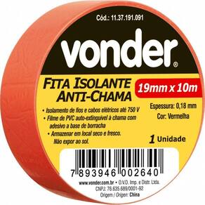 Conteúdo da embalagem1 Fita isolanteAplicações e dicas de usoIndicada para isolar fios e cabos elétricosDestaques e diferenciaisFita antichama com temperatura de trabalho de -10C até 80C DETALHES TÉCNICOS Largura x comprimento da fita isolante: 19 mm x 10 m Material da fita isolante: Filme de PVC com adesivo a base de borracha Cor da fita isolante: Vermelha Espessura da fita isolante: 0,18 mm Tensão máxima de isolamento da fita isolante: 750 V Ean: 7893946002640