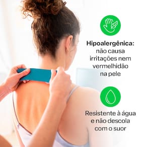 Hipoalergenica: nao causa irritacoes na pele; Resistente a agua e suor, e nao descola com facilidade da pele; Composicao: 93 algodao e 7 elastano;