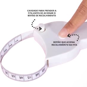 Retrátil (só apertar o botão) e com stop na medição(trava na medição feita)Cor: brancoTamanho da fita: 150cm (1,5 metros)Tamanho: 8,1 cm x 5,5 cm x 2 cmMaterial: ABS + PVC + MicrofibraOBS: A fita métrica começa medir à partir do 5cm devido o tamanho da circunferência total da base com a fita.