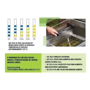 -fácil de usar: basta mergulhar a fita na gordura em temperatura de uso; -leitura em 20 segundos, por meio da mudança de cor nas fitas de teste; Evita desperdícios, otimizando a vida útil dos óleos e gorduras; Evita o consumo de óleo saturado; Ajuda a diminuir a quantidade de óleo eliminado, altamente poluidor, no meio ambiente; Reduz o descarte desnecessário, gerando economia para o restaurante; Mostra preocupação com o bem-estar e a saúde do consumidor; Embalagem contém 1 Frasco com 20 tiras do produto; Marca: 3M.