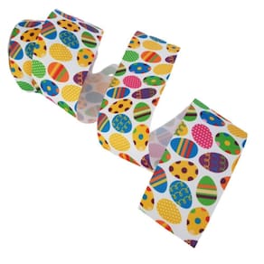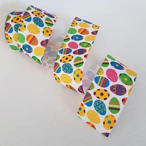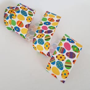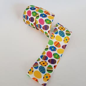 Fita Decorativa em poliéster na cor branca com mini ovinhos coloridos, Rolo com ;9,14m de comprimento X 6.50cm de largura.