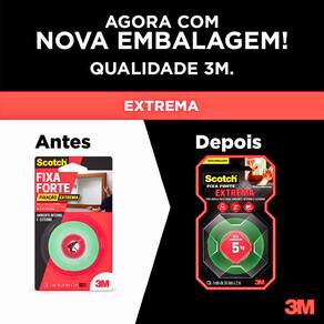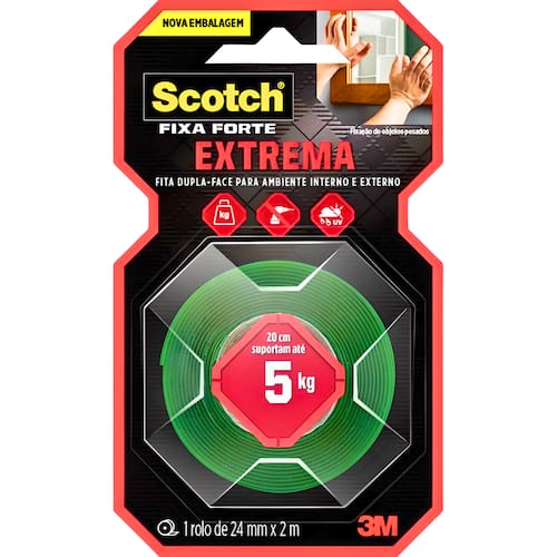 A Fita Scotch Fixa Forte da 3M! Super facil de aplicar, resiste a mudancas climaticas, evita sujeira e futuros reparos, pois ela e de adesao permanente. Uniao translucida e permanente entre diversos materiais acrilico, vidro, plastico e metais. Evita perfuracao de superficies. Promove isolamento anticorrosivo entre chapas metalicas. Especificacoes: Composicao: Massa de adesivo acrilico transparente de alta adesao e Liner de polietileno verde. Poder de Fixacao: Cada 15 cm de fita suportam 5 kg. Uso: Ambiente interno e externo, quadros pesados, espelhos grandes, objetos de decoracao, porta-chaves, rodapes, paineis, puxadores, numeros de casa em areas externas, caixas de correio etc. Dimensoes 24mm x 2m.