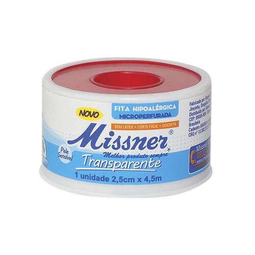 Fita Transparente Hipoalérgica Missner 2,5cm x 4,5m- Hipoalérgica- Microperfurada- Sem látex- Corte Fácil- Discreta- Para Pele Sensível Não machuca pele - Manter fora de umidade e calor- Fita transparente fosco, super discreto na pele, alta flexibilidade aos movimentos e de fácil corte. Seus furos permitem a respiração da pele.- Composição: Fita adesiva composta por filme termoplástico microperfurado e adesivoAcrílico hipoalergênico.- Indicação: fixação de curativos secundários, sondas, drenos, dispositivos de infusão intravenosa, cateteres, e outros procedimentos clínicos que exijam fixação, em regiões de pele sensível. Indicado para cirurgias estéticas devido ao produto ser mais discreto. Isento de látex de origem natural.Registro ANVISA: 80003300012