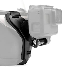 Coloque o suporte no queixeira e jogue as 2 alças superiores para dentro do capacete, pegue uma das alças de baixo e engate com uma das de cima e pressione a trava e por fim repita o processo com a segunda alça. Ao final, verifique a angulação da câmera e se for preciso realize a adequação necessária.