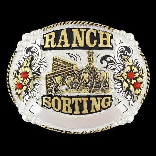 Fivela Ranch Sorting Master fabricada em metal com banho nas cores Prata, Preto e Dourado com detalhes em alto relevo e pedras strass.
