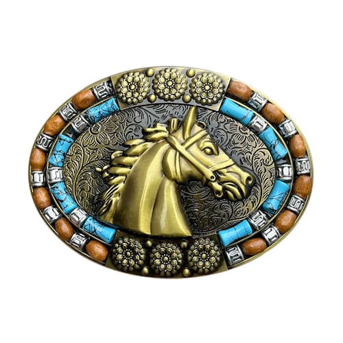 Material: liga leve Peso: 61 g Tamanho: 10,1 x 7,4 cm Design detalhado de cabeça de cavalo: apresenta uma impressionante cabeça de cavalo em latão antigo, simbolizando força e elegância, perfeita para roupas com tema de cowboy. Detalhes vibrantes em miçangas e turquesas: a fivela é adornada com detalhes coloridos de turquesa e miçangas, adicionando um toque de estilo único ao seu guarda-roupa. Construção em liga durável: feita de liga de alta qualidade, garantindo durabilidade e um acabamento vintage que aprimora sua aparência robusta. Estilo cowboy ocidental: ideal para uso ocidental, de rodeio ou casual, essa fivela traz um toque ocidental às suas roupas casuais. Ajuste perfeito: projetado para caber em cintos padrão de 39 mm, fornecendo um acessório seguro e elegante para qualquer ocasião.