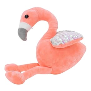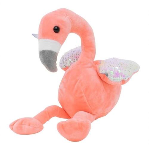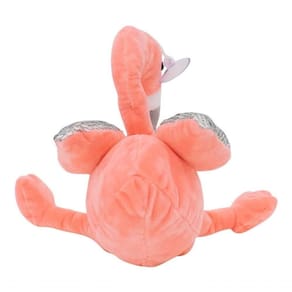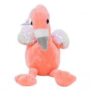Flamingo de pelúcia na cor rosa com 18 cm de altura medido sentado. Possui asas revestidas de lantejoulas brilhantes. Olhos de plástico. Vem com ventosa. Material: poliéster; Enchimento: fibra de poliéster; Produto certificado por Órgão acreditado pela CGCRE do INMETRO