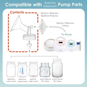 2. Além de encaixar o protetor de refluxo da Spectra, você pode usar os protetores de refluxo de haste curta da Maymom. Você também pode usar o conector de tubulação da Maymom (vendido separadamente) para conectar esta flange a muitas outras bombas de leite populares no mercado.
