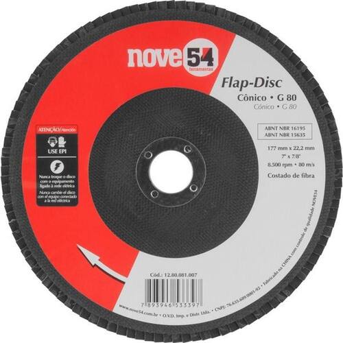 Produto: Flap | Marca: Nove54 | Modelo detalhado: Flap-Disc Cônico 7 G80 Costado Fibra - Nove54 | Tipo de discos e rebolos: De desbaste | Número de dentes: 0 | Modelo: 1280081007 | Diâmetro central: 7 | Diâmetro do disco de corte: 7 | É escova: Não | MPN: 1280081007 | Cor: Vermelho e Branco | Tipo de ferramenta: Flap | Código universal de produto: 7893946533397 | É kit: Não | Grão: G 80