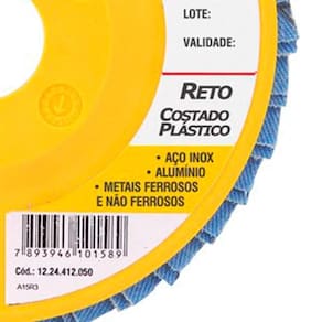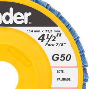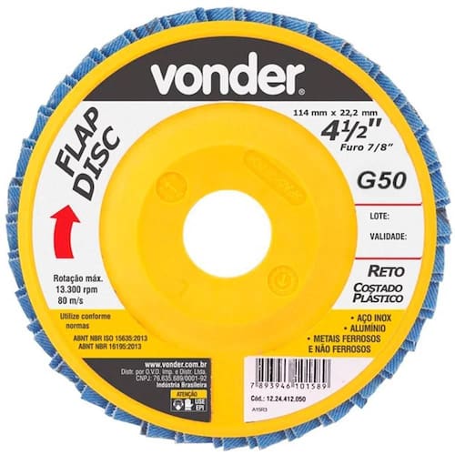 Flap Disc Desbaste Reto 4.1/2 G 50 Vonder 1224412050 Descrição do Produto Disco permite atividades de desbaste e acabamento ao mesmo tempo, eliminando a troca de discos. Proporciona menor vibração e ruído comparado com o disco de desbaste convencional. Indicado para desbaste e acabamento em aço inox, alumínio, metais ferrosos e não ferrosos com esmerilhadeiras angulares. - Diâmetro externo do disco de desbaste/ acabamento flap-disc: 4.1/2 - 115mm - Diâmetro do furo do disco de desbaste/ acabamento flap-disc: 7/8 - 22,23mm - Grão: G 50 - Tipo de costado: Plástico - Tipo do perfil do disco de desbaste/acabamento flap-disc: Reto - Tipo do grão abrasivo: Óxido de zircônio - Rotação máxima: 13300RPM - Velocidade periférica máx. : 80m/s - Norma de referência: ABNT NBR 15635 / ABNT NBR 16195 - : 03 meses - Marca: VONDER Ref.: VONDER-1224412050 Marca.: VONDER Imagens meramente ilustrativas Todas as informações divulgadas são de responsabilidade do Fabricante/Fornecedor Marca: Não Informado