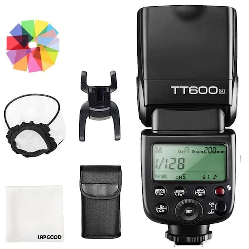 Dados técnicos. Modelo do produto: TT600S Guia Nº. (1/1 potência @ 200 mm): GN60 (m ISO 100) Ângulo de rotação vertical: -7° a 90° Ângulo de rotação horizontal: 0° a 360° Fonte de alimentação: baterias Ni-MH (recomendadas) ou 4 pilhas alcalinas LR6 Flash de potência total: aprox. 230 (baterias Ni-MH de 2500mA) Tempo de reciclagem: aprox. 0,1 a 2,6 segundos. O indicador LED vermelho acenderá quando o flash estiver pronto. Duração do flash: 1/300s - 120.000s Temperatura de cor: 5600 = 200 K Função de flash sem fio: mestre, escravo, desligado Grupos escravos controláveis: 5 (A,B,C,D, E) Alcance de transmissão (aprox. ): 100 m Canal: 1~32 Dimensão: 64 mm x 76 mm x 190 mm Peso sem bateria: 400 g Peso com bateria: 500 g - Com o sistema X sem fio GODOX 2.4G integrado, o TT600S é compatível com AD360II-C, AD360II-N, TT685C, TT685N, TT685S, X1T-C, X1T-N, X1T-S etc. - TT600S pode alcançar funções de sincronização de alta velocidade de 1/8000s ao usar em combinação com gatilhos de alta velocidade, por ex. Transceptor GODOX Cells II, disparador de flash sem fio X1 X2 XPro TTL, etc. Observação: o modo de disparo de sincronização de alta velocidade não está disponível quando o TT600S é montado na câmera. - GN60 (m ISO 100, @105 mm), 22 passos de potência de saída (1/1~1/128). Aprox. Tempo de reciclagem de 0,1-2,6s, 230 flashes de potência total (usando baterias Ni-MH de 2500mAh). Suporta modos M/Multi/S1/S2, zoom automático/manual de 20-200 mm. - No modo de transmissão sem fio de 2,4 G, quando utilizado como uma unidade mestre, o TT600S pode definir seu grupo como M/A/B/C/D/E; quando utilizado como uma unidade escrava, o TT600S pode definir seu grupo como AB/C/D/E. Existem 1 ~ 32 canais a serem escolhidos. - Equipado com uma porta de controle sem fio e um conector de cabo de sincronização de 3,5 mm, o TT600S tem vários métodos de acionamento.