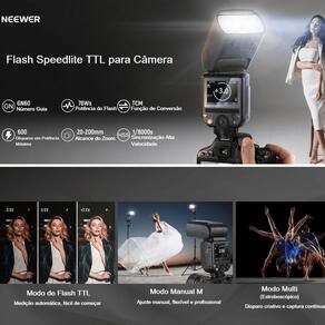 Se você fotografa com câmeras canon e precisa de um flash speedlite confiável, rápido e potente, o flash speedlite neewer z880-c e-ttl com bateria recarregável inclusa pode ser um daqueles acessórios que viram companheiro fixo na mochila. Ele vem com sincronização de alta velocidade hss , suporte total ao sistema canon e-ttl e e-ttl ii e ainda traz um transmissor sem fio de 2.4ghz integrado, o que facilita muito quando se trabalha com vários flashes ao mesmo tempo.Com um número guia 60 em iso 100 / 200mm , a luz que ele entrega é bem forte e consistente, ideal tanto para retratos quanto para ensaios em locais mais amplos. Este flash speedlite neewer z880c ttl para câmeras canon possui temperatura de cor é equilibrada em 5600k 200k , próxima da luz do dia, deixando os tons mais naturais. Na parte traseira, a tela lcd hd iluminada ajuda a navegar nas funções sem complicação.Potência e rapidezeste flash speedlite para canon companha um bateria neewer nb-z1 recarregável inclusa garante cerca de 600 disparos em potência máxima e um tempo de reciclagem de apenas 1.5s. Ou seja, você não perde momentos importantes entre um clique e outro. Possui uma porta usb para atualizações de firmware.Versatilidade na iluminaçãoa cabeça do flash neewer z880c inclina de -7 até 120 e gira 330, perfeita para rebater luz em paredes e tetos. Além disso, conta com uma luz led de modelagem com 10 níveis de intensidade para pré-visualizar a cena.Modos criativoso flash speedlite neewer z880 canon trabalha nos modos ttl, manual e estroboscópico rpt . No ttl, você tem compensação de exposição de até 3 ev 19 níveis . No manual, o controle vai de 1/256 a 1/1 81 níveis . Já no rpt, dá pra programar até 100 disparos estroboscópicos a 199 hz. Também estão presentes os modos s1/s2 slave óptico , sincronização de 1 e 2 cortina e hss até 1/8000s.Sistema wireless neewer integradoo sistema sem fio neewer wireless 2.4g permite trabalhar como mestre ou escravo slave , com até 100m de alcance sem obstáculos. São 4 grupos mestre, 5 grupos escravo, 32 canais e 99 ids, o que garante estabilidade mesmo em ambientes cheios de fotógrafos usando rádio flash. Ele é compatível com os disparadores neewer qpro wireless vendidos separadamente .Compatibilidade ampla com canoncâmeras canon mirrorless e dslr compatíveis r8, r6, r5, r3, r, m6, t8i, t7i, t6s, t6i, t5i, t5, 7d mark ii, 7d, 6d mark ii, 6d, 5d mark iv, 5d mark iii, 5d mark ii, 1d mark iii, 1dx, 90d, 80d, 70d, 60d, 50d, 77d, sl3, entre outras.Obs. Não é compatível com as câmeras canon mirrorless rp e r50.