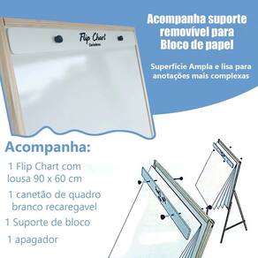 Flip chart quadro branco madeira 60 x 90 apagador caneta Flip chart branco com lousa serve para folha e caneta O flip chart carimbras é a escolha ideal para quem busca um quadro resistente, prático e funcional para apresentações, treinamentos ou organização de ideias. Feito de madeira de alta qualidade, ele oferece estabilidade e segurança, sendo perfeito para professores, profissionais em home office e empresas que precisam de um suporte confiável para anotações. Possui um dispositivo para fixação de blocos de papel, permitindo que você faça anotações de forma dinâmica e organizada. Possui bandeja porta-marcador com um acabamento durável e sustentável. Atençaõ: você pode usa-lo com papel ou escrever com a caneta para quadro branco diretamente na lousa. Especificações técnicas: