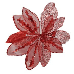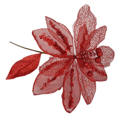 Flor Artificial Natalina Poinsétia (Espirito Santo) vermelho, estrutura em arame com entretela e tule com detalhes de lantejoulas e glitter e haste de arame revestido com 47cm.