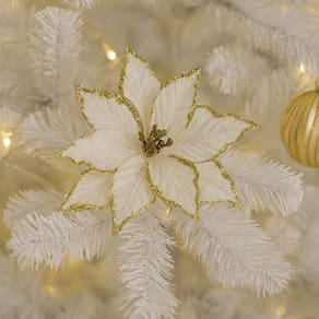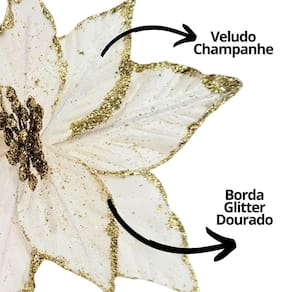 Com essa flor de Natal em veludo champanhe com glitter dourado, sua decoração ficará ainda mais sofisticada, iluminando o ambiente com um charme delicado e festivo.