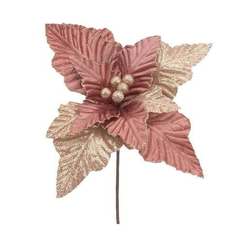 Poinsétia folhas rosa e folhas glitter ouro - Embalagem de Venda: 1 UN - Cor Predominante: ROSA / OURO - Instruções de Limpeza: Limpar somente com pano macio e seco. - Composição: Plástico, Poliéster, Metal e Isopor