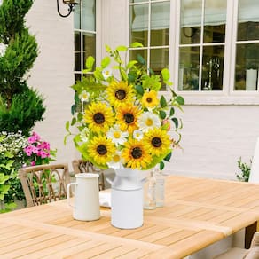 Flores artificiais em vaso de 23,5 polegadas - 🌼 Flores artificiais em vaso: este requintado buquê de margaridas artificiais em vaso apresenta 6 peças de girassóis realistas, complementados por delicadas margaridas brancas e amarelas, caules verdes de eucalipto, frutas verdes e folhas decorativas atraentes. Perfeitas para decoração de mesa de jantar - 🌻 Aparência realista: essas flores artificiais de girassóis são feitas de seda e tecido, imitam a aparência de flores recém-desabrochadas. As bagas são feitas de espuma e os caules são enrolados em arame. As pétalas delicadamente trabalhadas e as cores frescas criam um deleite visual para os olhos. - 🌼 Traga a luz do sol para dentro de casa: as flores falsas no vaso têm 23,5 polegadas de altura, o vaso de metal branco com alça tem 7,5" L × 4,2" W. Estável e durável, proporcionando estabilidade ao arranjo, pode ser facilmente colocado em qualquer espaço para uma decoração aconchegante - 🌻 Longa duração e baixa manutenção: peças centrais de girassol para mesas nunca murcham nem morrem, não são regadas, recebem luz solar ou fazem outra manutenção. Os girassóis artificiais sempre ficam brilhantes e bonitos. Aproveite suas férias prolongadas a qualquer momento sem se preocupar com suas plantas! - 🌼 Decoração multiuso: flores artificiais com vasos são perfeitas para decoração de interiores e exteriores, decoração de casamento, festa, balcão de cozinha, cômoda, estante de livros, sala de estar, decoração de batismo, lareira, quarto, mesa de jantar, casa de fazenda moderna ou qualquer outro lugar que você precise de decoração.