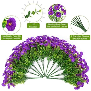 Ouddy Decor 24 pacotes de flores artificiais para atividades ao ar livre, flores falsas de glória da manhã, plantas de eucalipto, resistentes a UV para porta da frente, varanda, pátio, jardim, primavera, verão, decoração