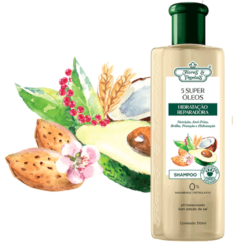 O Shampoo 5 Super Óleos Hidratação Reparadora Flores & Vegetais, foi desenvolvido para atender todas as necessidades de diferentes tipos de cabelos. Sua fórmula foi elaborada a partir da associação de lendários óleos nobres (abacate, amêndoas, coco, trigo e jaborandi) que reunidos, auxiliam na retenção da umidade dos fios, proporcionando hidratação, ajudando a combater o ressecamento e controlar o frizz, além de nutrir reparando o fio danificado, levando força e vitalidade aos cabelos.