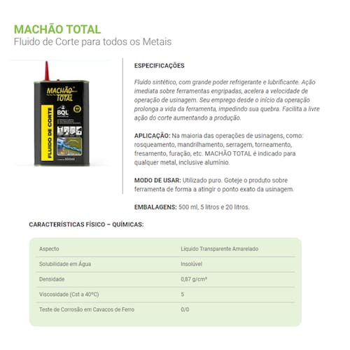 APLICAÇÃO: Na maioria das operações de usinagens, como: rosqueamento, mandrilhamento, serragem, torneamento, fresamento, furação, etc. MACHÃO TOTAL é indicado para qualquer metal, inclusive alumínio.