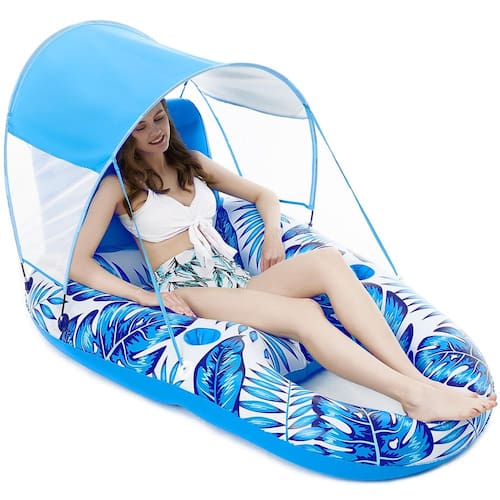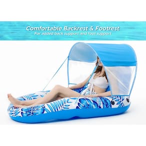 Flutuador inflável para piscina – boias de piscina para adultos, boias flutuantes, jangadas, cadeira flutuante de água para piscina, lago, lounge, boia com porta-copos na praia, piscina, festa, brinquedos, tamanho adulto - Boia inflável para piscina com cobertura solar mais alta e removível – o dossel é mais alto, oferece uma melhor visão e o máximo conforto. Bem ventilado e FPS 50, tem ótimo fluxo de ar para ficar fresco e confortável. Postes de suporte mais espessos para maior estabilidade. Design pendente de patente. - Encosto e apoio para os pés confortáveis – Esta piscina inflável flutua para adultos como encosto de apoio e apoio para os pés, permitindo que você flutue confortavelmente para horas de diversão e relaxamento nos dias quentes de verão. - Boia para espreguiçadeira de piscina com 2 suportes de copo – as boias de piscina projetadas com porta-copos embutidos. Você sempre pode tomar sua bebida enquanto aproveita o tempo na boia. - Assento de malha refrescante – boia de piscina para cadeira de água com fundo de malha macia mantém você fresco. Sem desconforto por gravidade. Espreguiçadeira inflável perfeita para festas na piscina ao ar livre, praia, lago, rio e muito mais. - Área fresca para os pés – a boia inflável foi projetada com uma área onde você pode colocar seus pés e pernas na água para se divertir com água fria e espirrar. Boias perfeitas para flutuar na piscina para adultos. - Relaxamento flutuante definitivo com esta espreguiçadeira flutuante para piscina: grande estabilidade, tamanho adulto, sente-se, relaxe e tenha a experiência premium de espreguiçadeira de piscina - Vinil premium – a boia de piscina para adultos é feita de material não ftalatos de qualidade superior, grosso e resistente, macio e premium. Suporta até 136 kg. Garantimos a qualidade desta boia e estamos felizes em fornecer uma garantia do fabricante de 6 meses sem custo adicional.