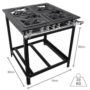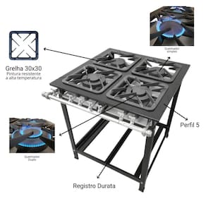 Características Técnicas: Funcionamento a gás GLP baixa pressão Estrutura em aço carbono com pintura a pó eletrostática Espessura 0,9mm (Chapa 20) Tubo de alimentação de gás de 1" 1 Grelha de ferro fundido 30x30 Registro regulador Palito Durata Consumo de gás queimador simples: 0,175kg/h Totalmente desmontável para facilitar o transporte e armazenamento Queimador simples: 130mm Queimador duplo: 175mm